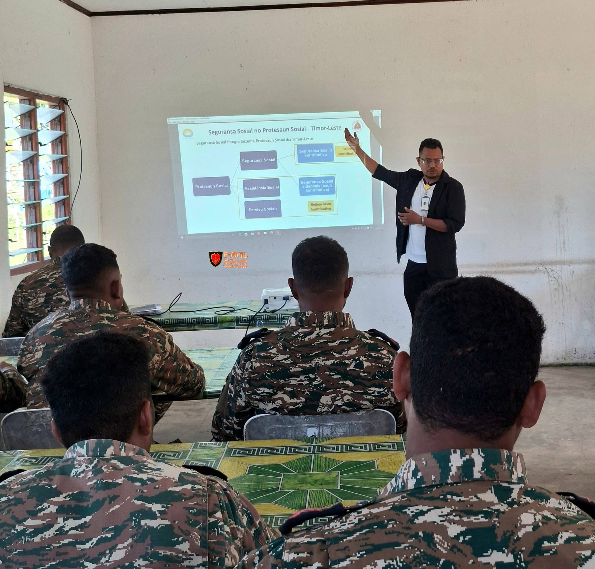 FALINTIL- Forsa Defesa Timor Leste liu husi Divizaun Pesoal F-FDTL hamutuk ho Institutu Nasionál Siguransa Sosial (INSS) kontinua halo Sosializasaun Lei kontrutivu Seguransa Sosial nian bá Militár sira iha Postu Destakadu Ainaro iha Parte Dader no parte Loraik kontinua kedas halo sosializasaun iha Postu destakadu Betano.
