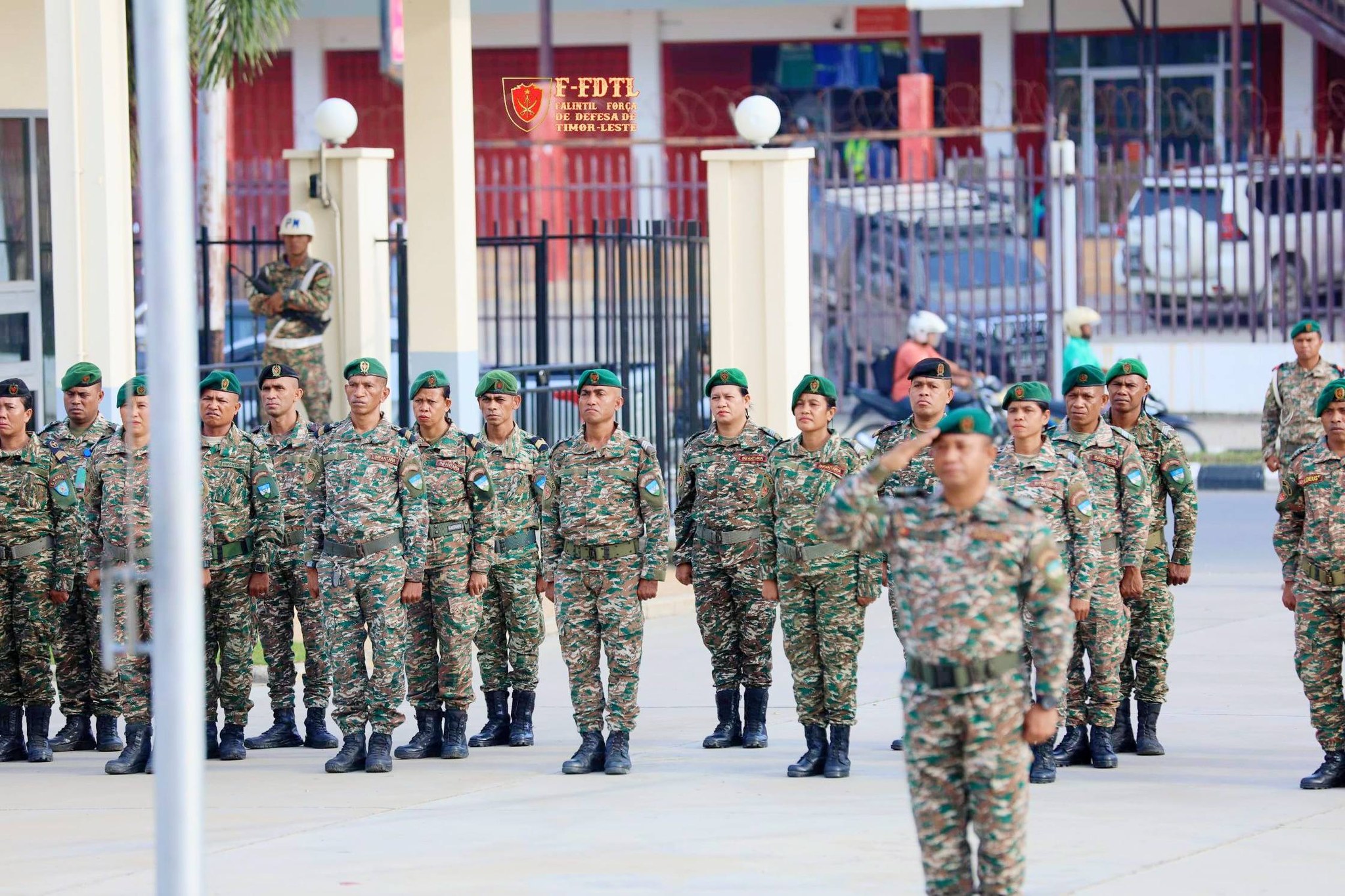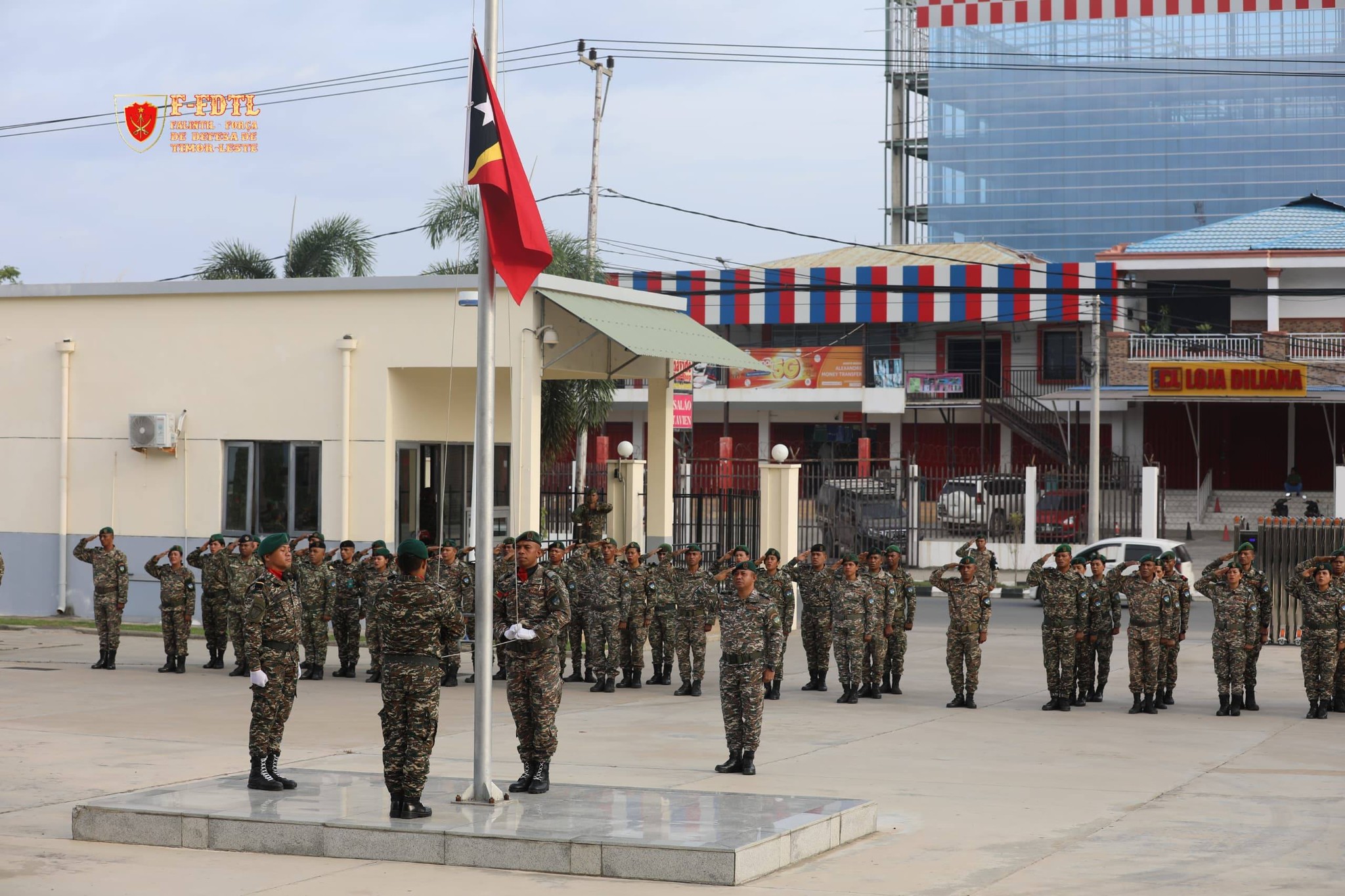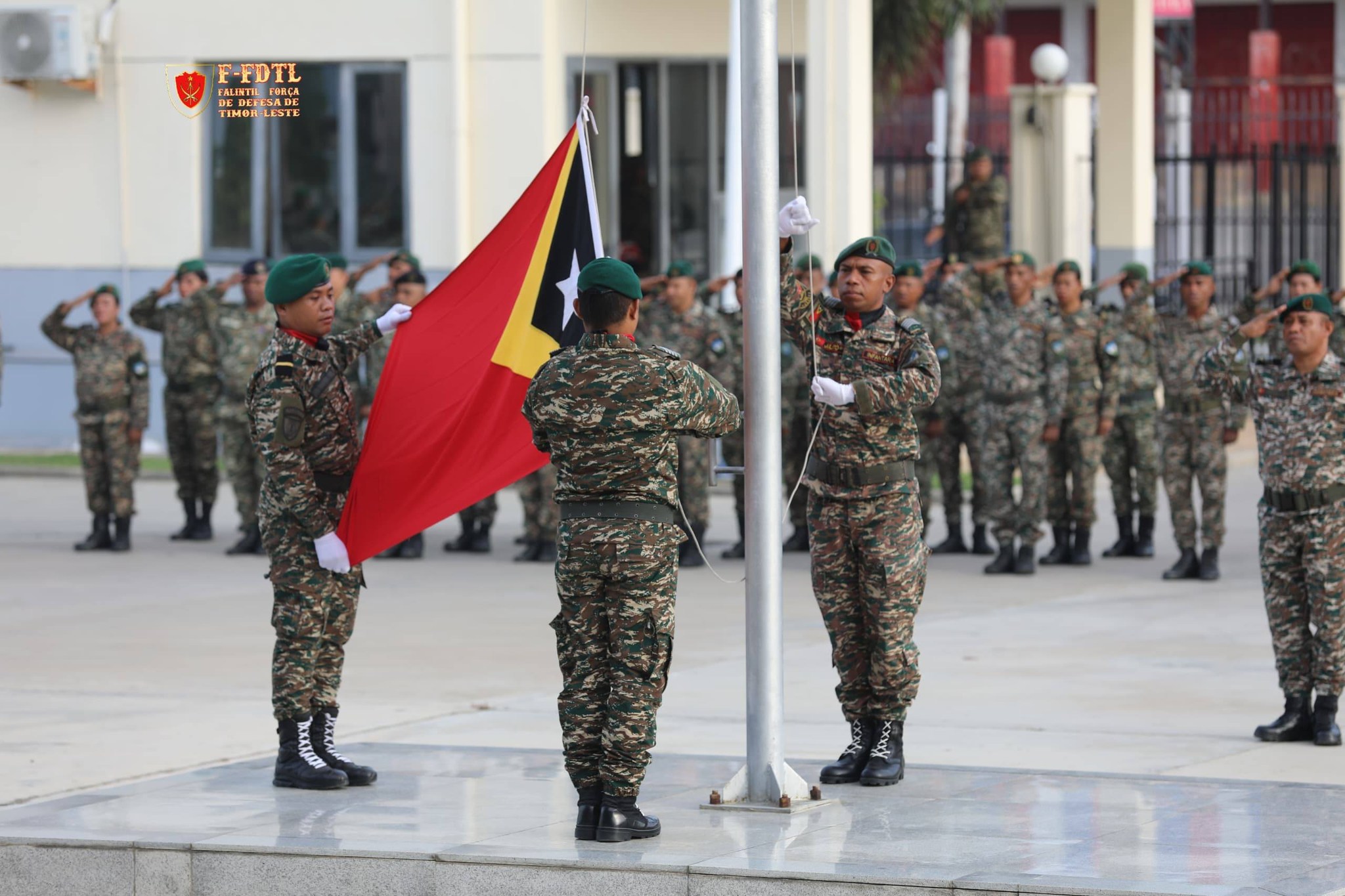 FALINTIL-Forsa Defeza Timor-Leste (F-FDTL) hamutuk ho Funsionariu Ministériu Defesa (MD) Institutu Defeza Nasionál (IDN), Autoridade Marítima Nasionál (AMN) ohin realiza serimónia hasa'e Bandeira Nasionál bá semana dahuluk fulan marsu, iha resinto Kuartel Jenerál Fatuhada, Díli.