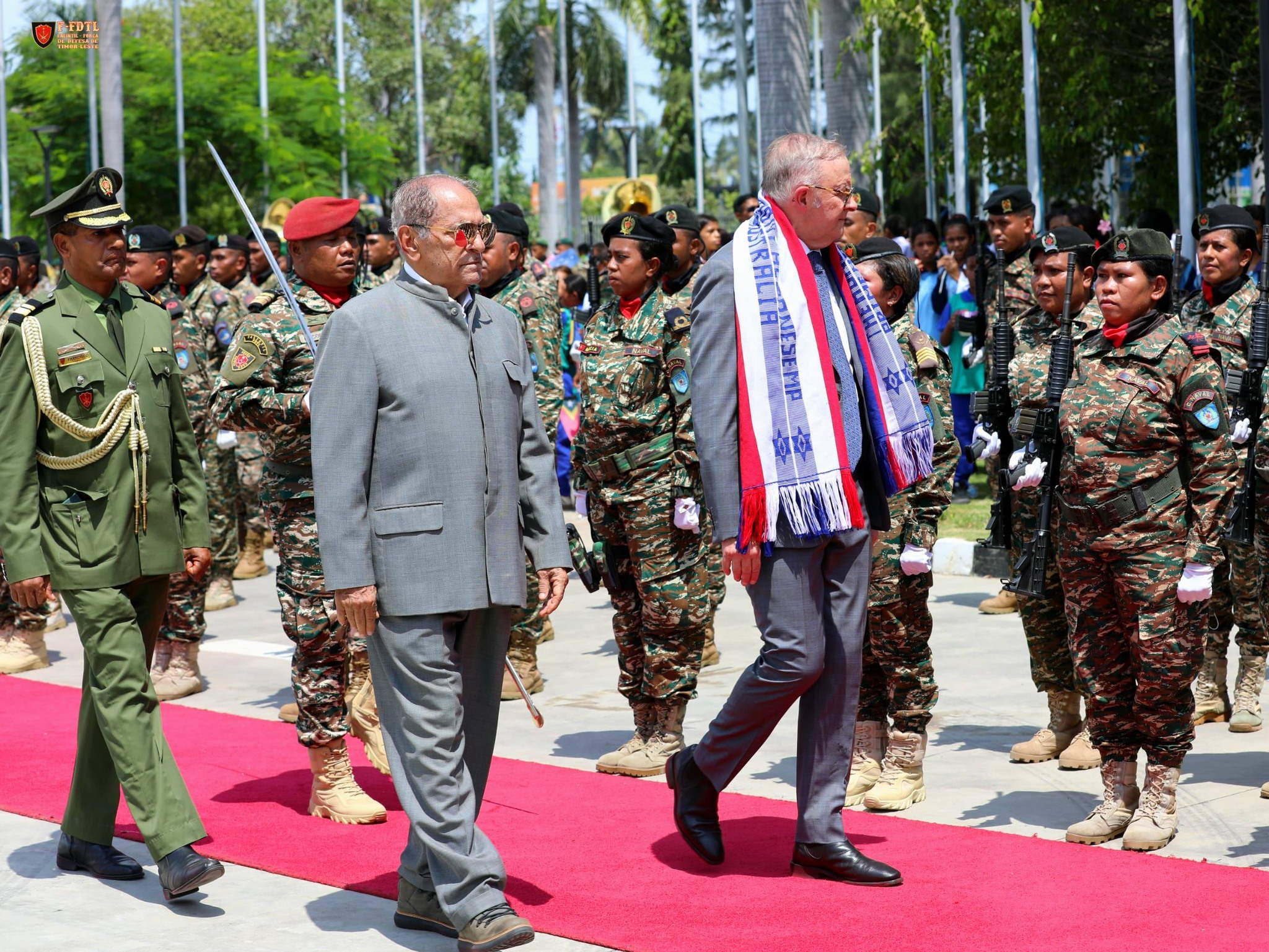 Primeiru Ministru Australia, Anthony Albanese, to’o iha Timor-Leste simu direta husi Prezidente Repúblika José Ramos-Horta ho Primeiru Ministru Kay Rala Xanana Gusmão iha Aereoportu Internasionál Nicolau Lobato Comoro Dili hetan guarda ondra husi FALINTIL-Forsa Defeza Timor-Leste (F-FDTL).